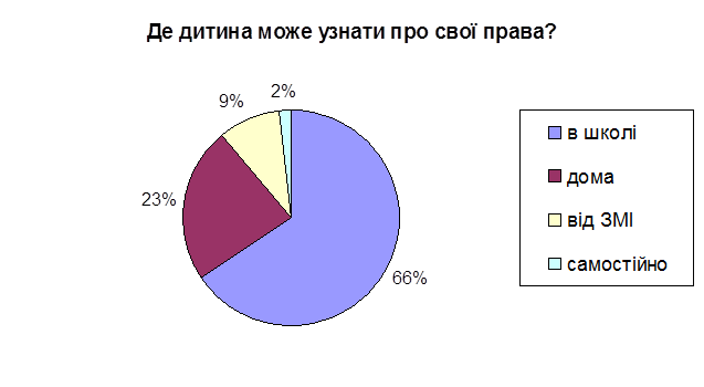 Опитування засвідчило, що більшість дітей України почуваються безправними в світі дорослих, що в них обмежені можливості висловлювати і обстоювати свої думки, що часто-густо вони навіть не знають, до кого звернутись у разі порушення їх прав. Третина експертів (з 99 опитаних) вважають, що ніхто з дорослих не сприймає дітей як повноправних членів суспільства. Більшість дійшли висновку, що спроби дитини відновити справедливість в тій чи іншій установі або закладі без допомоги дорослих приречені на невдачу. За думкою міжнародних експертів, в Україні потрібно створити систему закладів, куди б могла звернутися дитина за роз’ясненням гарантованих їх прав. Але якщо вже немає таких закладів до сих пір, то замислюєшся: а може, дорослих влаштовує, щоб їхні діти нічого не знали про свої права?