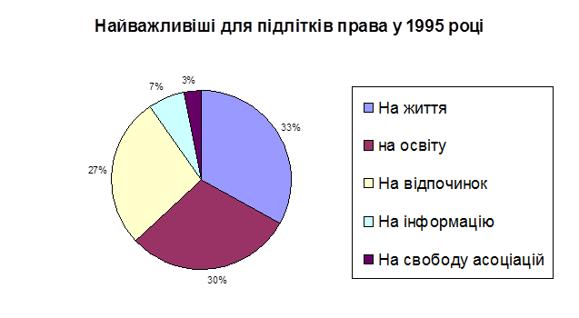 Результат опитування показав, що діти, які не чули про ті чи інші свої права, гарантовані Конвенцією ООН, складають 9-28%. Найменше діти знали про свої права на захист від втручання в особисте життя, від шкідливої інформації, сексуальної експлуатації та небезпечної праці. Майже кожна восьма дитина повідомила про порушення її прав, а кожна четверта була свідком того, як порушувалися права інших дітей. У дев’яності роки – у 1990, 1995, 2000 роках співробітником Інституту молоді (Москва) С.Н.Щегловою проводилось анкетування підлітків України, пов’язане зі з’ясуванням того, що вважають діти і підлітки своїми громадянськими правами та якими з них, по їх відчуттям, вони можуть скористатися. Ось результати цього опитування: