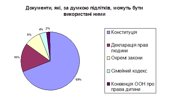 Приємно вражає, що у 2000 році з усіх опитаних не було жодної дитини, яка б відмовилась відповідати на ці питання або не знала відповіді. В середньому кожний назвав по 9 основних прав і свобод громадян. При цьому анкетуванні з’ясувалось, що більше четверті респондентів не знали відповіді на питання про назву документа, де записані їх основні права й свободи. Основними документами були названі: