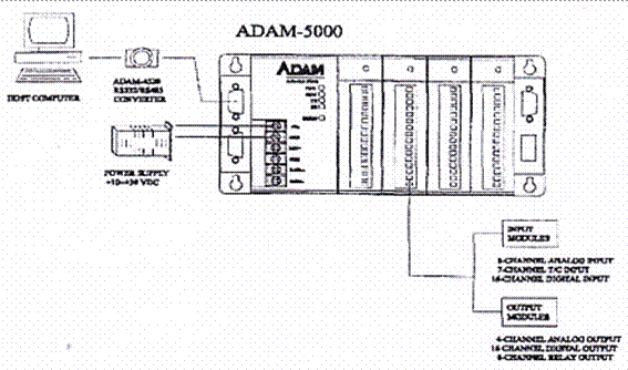 Удобство коммуникационного порта ADAM-5000E предлагает следующую возможность. Пользователи могут одновременно подключить COM1 и COM2 ведущего PC к RS-232 и RS-485 порту ADAM-5000E. Когда ведущий PC дает команду через один из COM портов, но не получает ответ, функция резервной копии COM порта программного обеспечения HMI (например APX, FIX) автоматически переключит к другому COM порту, чтобы продолжить выполнение программы без какого-либо влияния на систему. Системная конфигурация На рис. 4 показана системная конфигурация, возможная с устройством ADAM-5000 и общая схема подключения.