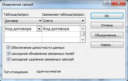Схема 5.7 Связи таблиц базы данных Для всех связей, представленных на схеме, включено обеспечение целостности данных, и каскадное удаление связанных записей. Данные настройки позволяют избежать удаления записей из родительских таблиц, если в дочерней таблице («Смета») есть ссылки на эту запись.