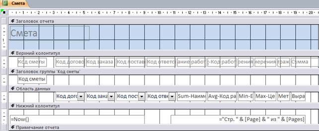 Рисунок 8.2 Экранная форма отчетов 9.3 Описание отчётов Отчет «Смета» создан с использованием мастера создания отчетов на основе двух запросов (см. отчет в режиме конструктора на рисунке 9.1)