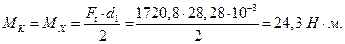 Для изготовления быстроходного вала выбрали материал сталь 40Х, твердость не менее 200НВ; s - 1 = 320 МПа и t- 1 = 200 МПа – пределы выносливости при симметричном цикле изгиба и кручения. Строим расчетную схему вала. Из предыдущих разделов имеем Силы в зацеплении: Ft =1720,8Н, Fr =632,7 Н. Fa=266,39Н. Консольная сила от муфты: Fм=500Н. Реакции: RDy =300,81 Н, RBy =331,89 Н, RBx=-254.15 Н, RDx= 966,65 Н. Расстояния: l б = 240 мм, l м = 51 мм Определим величину изгибающих моментов в характерных сечениях А, B, С, D. В горизонтальной плоскости. слева: MDy = 0; MСy = - RDx ·½ l б =-966,65×120×10-3=-115,99 Н·м; MBy =- RDx · l б+ Ft· ½ l б=-966,65×240×10-3+1720,8×120×10-3=-25,47 Н·м; MАy = 0; Проверка: справа: MBy = – Fм·lм = -500×51×10-3= -25,5 Н·м; В вертикальной плоскости. слева: MDx = 0; MCx1 = RDy ·½ l б =300,81×120×10-3 =36 Н·м; MCx2 = RDy ·½ l б + Fа ·½ d 1=300,81×120×10-3 +266,39×14,14×10-3 =39,76 Н·м; справа: MAx = 0; MBx = 0 Н·м; Проверка: справа: MСx = ½ RBy · l б =165,9×240×10-3 = 39,8 Н·м. Крутящий момент в сечениях вала.