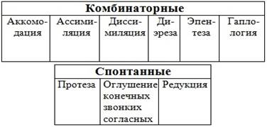 Звуки речи произносятся в потоке связной речи; за счет принципа экономии артикуляционных затрат возможны два тина фонетических процессов: комбинаторные и спонтанные. Комбинаторные фонетические процессы связаны с влиянием соседних звуков, когда рекурсия предшествующего звука взаимодействует с экскурсией последующего. Спонтанные фонетические процессы связаны с влиянием общих условий произношения: влиянием начала и конца слова, характера слога, позиции но отношению к ударению. Комбинаторные изменения обусловлены фонетическими процессами аккомодации (рассмотренной в системе гласных), ассимиляции, диссимиляции, диэрезы (пропуска), эпентезы (вставки), гаплологии (поглощения) и др. Спонтанные изменения обусловлены фонетическими процессами протезы, оглушения звонких согласных в конце слова, редукции (рассмотренной в системе гласных) и др. Позиционные изменения звонких и глухих согласных