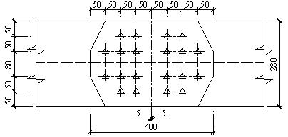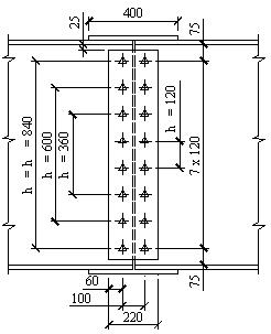 Принимаем толщину вертикальной накладки равной 0,8 hw = 0,6 мм. Равномерно располагаем чётное количество болтов в один ряд на вертикальной накладке (рис. 19) с расстоянием между болтами а = 120 мм.