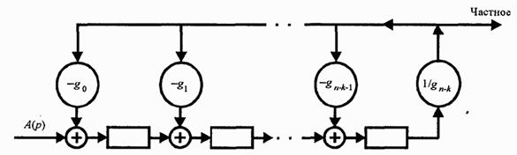 Схема деления реализуется на регистрах сдвига со встроенными сумматорами по модулю 2. Вид схемы определяется многочленом, на который производится деление. В процессе деления с помощью такого устройства находится остаток.