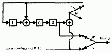 Предположим, что сообщением является цепочка 0110. Содержание сдвигового регистра дано таблицей: