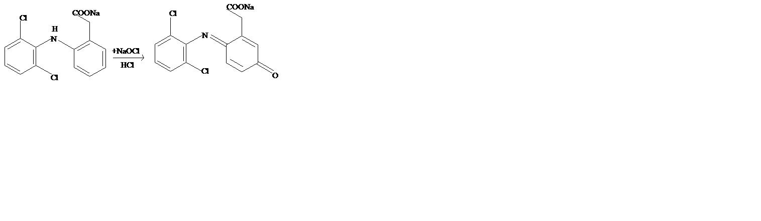 При исследовании возможности определения ПФЛ в таблетках “Диклопентил” производства РУП «Белмедпрепараты» (состав: диклофенака натрия - 50 мг; ПФЛ - 100 мг) оказалось, что раствор диклофенака натрия при взаимодействии с гипохлорит-ионами приобретает устойчивое желтое окрашивание в присутствии ПФЛ. Это наблюдение послужило основой для разработки способа идентификации диклофенака натрия и ПФЛ в одной пробе без предварительного разделения. ПФЛ применяется при нарушении периферического кровообращения, при диабетических ангиопатиях. Окрашенный продукт имеет характерный спектр поглощения в видимой области с максимумом при 461 нм, что и определяет желто-оранжевую окраску раствора [20]: