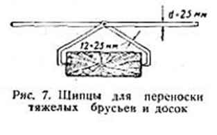 2.Вторым этапом заключается сушка пиломатериала. При перемещении тяжелых предметов с земли или пола, после станочной обработки, в лесосушильный цех для облегчения переноски лесоматериалов, при отсутствии подъемных кранов применяют приспособления, щипцы для переноски тяжелых брусьев и досок, показанные на рисунке 1.