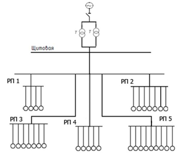 Рис. 4. Схема размещения выключателей Выключатель Q1: Iкаб = 25А, ставим силовой предохранитель с кварцевым наполнителем ПКТ 101. Номинальное напряжение: 12кВ; номинальный ток отключения: 40А 12кВ > 10 кВ 40 А > 25 A следовательно, предохранитель прошел проверку на работоспособность Выключатель QF1: Ставим автоматический воздушный выключатель серии А3000: тип А3710Б; Iном = 160 – 630 А; U = 440 В. Токоограничивающий с полупроводниковыми или электромагнитными расщипителями. Выключатели QF2, QF3, QF4, QF5, QF6: Ставим автоматический выключатель 3SM11 (NS) Iном = 300А.