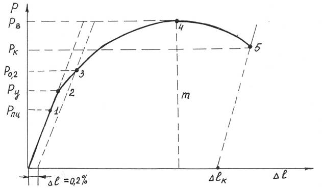 ром закреплена одна из головок образца (7). Сила Р и перемещение Δ l измеряют рычажным устройством (8), показываются стрелкой на циферблате (9) и одновременно записываются самописцем (10) на диаграммной бумаге в координатах «Р – Δ l». Существует возможность регулировки масштаба диаграммы в широких пределах для удобства обработки результатов испытаний. 4 ПЕРВИЧНАЯ ДИАГРАММА РАСТЯЖЕНИЯ И ЕЕ АНАЛИЗ Первичная диаграмма растяжения записывается в координатах «Нагрузка Р – абсолютное удлинение образца Δ l». По ней определяются основные механические свойства, характеризующие прочность и пластичность материала. При испытаниях на растяжение прочностные свойства определяются через напряжения σ, вызывающие определенную упругую или пластическую деформацию образца и рассчитываются по формулам типа: σ = Р / F, где F – площадь поперечного сечения образца. В системе СИ напряжения выражаются в мегапаскалях [МПа]. Ранее повсеместно использовалась размерность кг∙с/мм2, которая еще сохранилась в ряде официальных технических документов. Перевод единиц осуществляется очень просто: 1 кг∙с/мм2 = 9,8 МПа ≈ 10 МПа. По указанному выше принципу на первичной кривой растяжения можно выделить 5 основных точек – нагрузок для определения соответствующих напряжений (рис. 3).