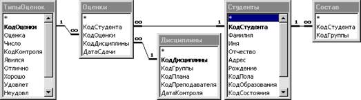Запрос должен содержать положительные оценки студентов выбранной группы. На базе таблиц Оценки, Дисциплины, Состав, ТипыОценок и Студенты создайте запрос ДолгиУдовлет, содержащий поля: Код, КодДисциплины, КодПлана, КодСтудента, КодГруппы и Удовлет.