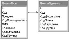 Запрос ДолгиГруппы Запрос должен содержать список студентов и дисциплин, по которым они имеют академические задолженности. На базе запросов ДолгиВсе и ДолгиУдовлет создайте запрос ДолгиГруппы, содержащий поля: ФИО, КодСтудента, Предмет, КодГруппы, КодПреподавателя и Код.