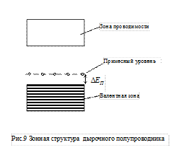 Энергетические уровни, на которые забрасываются электроны из заполненной зоны, называются акцепторными уровнями. Примесные атомы, которым принадлежать эти уровни, называются акцепторами. Температурная зависимость проводимости дырочного полупроводника имеет такой же вид, что и для электронного полупроводника.