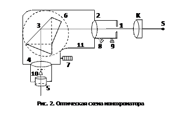 Схема экспериментальной установки представлена на рис. 2. 1. Свет от источника S проектируется конденсорной линзой K на входную щель 1, снабженную микрометрическим винтом 9, который позволяет открывать щель на нужную ширину. Рабочая ширина щели равна 0,02-0,03 мм. 2. Пройдя через щель, свет попадает на коллиматорный объектив 2, снабженный микрометрическим винтом 8, который позволяет смещать объектив относительно щели при фокусировке спектральных линий различных цветов и далее параллельным пучком проходит на сложную диспергирующую призму 3, установленную на поворотном столике.