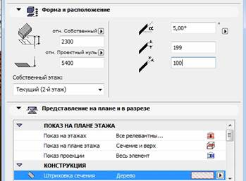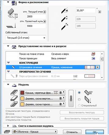 19. Выделяем навес и меняем в Параметрах толщину, для этого сначала меняем штриховку, а затем угол наклона