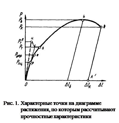 Деформацией называется изменение размеров и формы тела. Деформации разделяются на упругие и пластические. Упругие деформации исчезают, а пластические остаются после окончания действия сил. В основе упругих деформаций лежит обратимые смещения атомов вещества из положения равновесия; в основе пластических деформаций — необратимое перемещение одних частей тела по отношению к другим. Растяжение — простой и наиболее распространенный метод определения прочности и пластичности. Диаграмма растяжения в координатах «нагрузка — удлинение образца» (рис.1) включает в себя три части: 1) участок упругой деформации до нагрузки Р упр, 2) участок равномерной пластической деформации от Р упр до Р макс и 3) участок сосредоточенной деформации — развития шейки от Р макс до Р к.