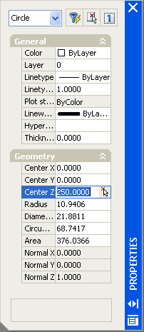 Рис. 1.5. Изменение уровня с помощью окна PROPERTIES В результате этого изменения окружность переместилась вверх на 250 мм (рис. 1.6). Если бы было нужно опустить окружность на 250 мм вниз, то мы бы задали Z = —250.