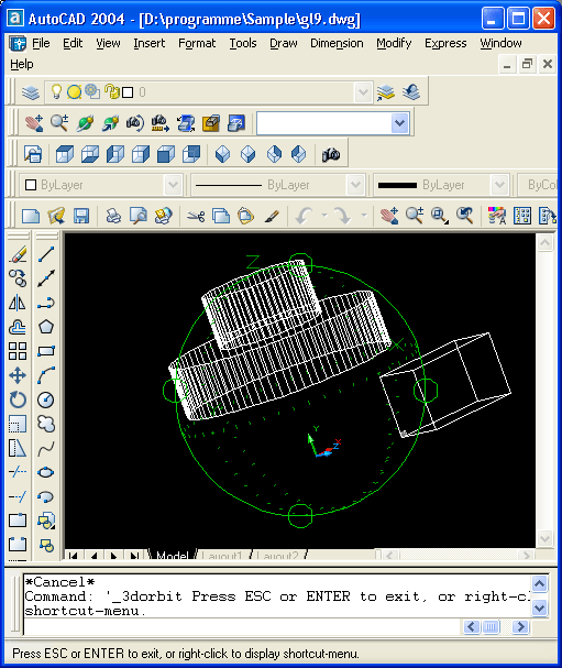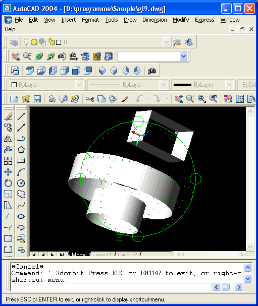 Команда позволяет динамически изменять вид трехмерных объектов с помощью устройства указания. Если в момент вызова команды в рисунке были выбраны какие-то объекты, то в дальнейших манипуляциях установки вида участвуют только они. При отсутствии выбранных объектов динамическое изменение показывает новое положение всех видимых объектов рисунка (хотя при большом объеме рисунка это может происходить медленно). На период работы команды 3DORBIT (3-ОРБИТА) знак ПСК изменяется на цветной знак трехмерных осей, а на виде появляется орбитальное кольцо (рис. 2.9).