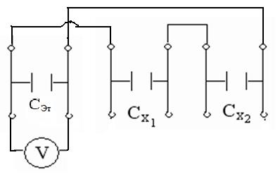 откуда т.е. при последовательном соединении конденсаторов суммируются обратные величины емкостей. Если дана емкость эталонного конденсатора Сэт, то неизвестную емкость другого конденсатора Сх можно определить следующим образом. Сначала конденсатор Сэт зарядить от источника постоянного тока (рис.5а). При этом накапливается заряд q. С помощью вольтметра измерить напряжение на обкладках конденсатора: