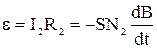 Во вторичной обмотке ток I2 возникает под действием ЭДС магнитной индукции ε. Если Ф - потокосцепление вторичной обмотки, S - площадь, охватываемая одним витком, a N2 - число витков во вторичной цепи, то Ф=BSN2 и