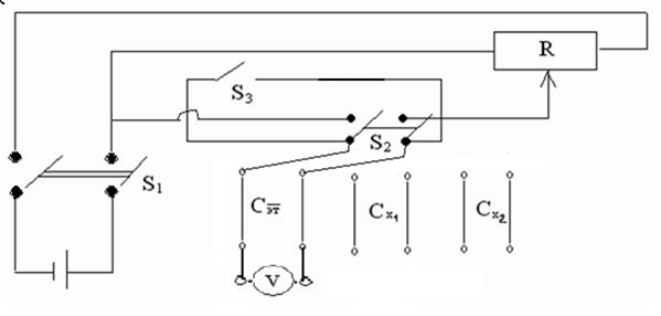 Цель работы: определение емкости конденсаторов и проверка законов последовательного и параллельного соединений конденсаторов. Приборы и оборудование: источник питания, вольтметр, потенциометр (R), эталонный конденсатор (Сэт), исследуемые конденсаторы (Сх1 и Сх2), переключатели.