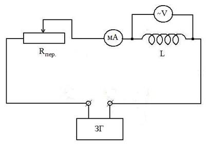 Цель работы: определение коэффициента самоиндукции катушки методом измерения ее полного электрического сопротивления (импеданса) по переменному и постоянному току. Приборы и оборудование: катушка индуктивности (L), переменное сопротивление (Rпер.), источник постоянного тока (ε), миллиамперметр переменного и постоянного тока (мА), вольтметр переменного тока (~V), вольтметр постоянного тока (=V), генератор электрических колебаний (ЗГ), источник постоянного тока (ε).