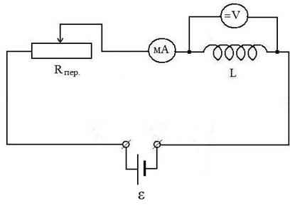 7. По формуле (11) вычислить полные сопротивления Z катушки индуктивности и найти их среднее значение Zср. 8. Собрать схему для определения омического сопротивления R катушки индуктивности при постоянном токе, рис.4. 9. Изменяя сопротивление Rпер., получить пять значений силы тока I и измерить соответствующие напряжения U на катушке индуктивности. 10. Результаты измерений занести в таблицу 2.