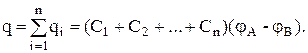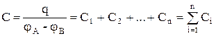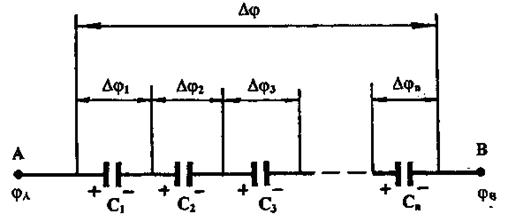 т.е. при параллельном соединении конденсаторов она равна сумме емкостей отдельных конденсаторов. У последовательно соединенных конденсаторов заряды всех обкладок равны по модулю, а разность потенциалов на зажимах батареи, см. рис. 4, равна