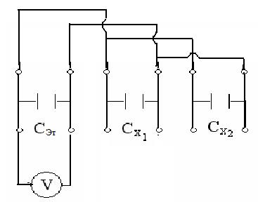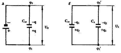 откуда т.е. при последовательном соединении конденсаторов суммируются обратные величины емкостей. Если дана емкость эталонного конденсатора Сэт, то неизвестную емкость другого конденсатора Сх можно определить следующим образом. Сначала конденсатор Сэт зарядить от источника постоянного тока (рис.5а). При этом накапливается заряд q. С помощью вольтметра измерить напряжение на обкладках конденсатора: