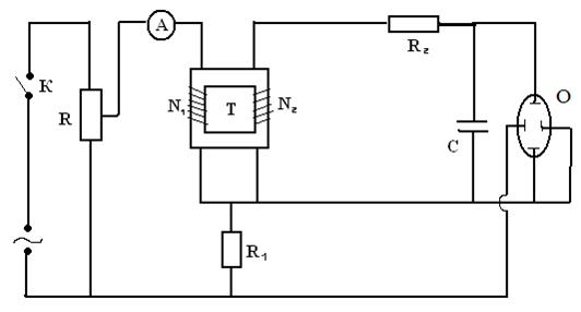 В данной работе петли гистерезиса ферромагнетика получают на экране электронного осциллографа. Известно, что электронный пучок отклоняется под действием электрического поля. Поэтому петли гистерезиса можно исследовать, используя метод электрических смещающих полей. Собирается установка, схематически изображенная на рис. 2. Основными ее элементами являются трансформатор Т с первичной и вторичной обмотками (с числом витков соответственно N1 и N2) и осциллограф. В первичную цепь трансформатора включают два сопротивления R и R1, а также амперметр.