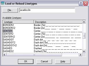 Команда: Layer (Слой)↵ →Диалоговое окно →Кнопка New (Новый)⊷ → ОСИ → Color (Цвет) ⊷ → White Белый)⊷→ ОК ⊷→ Linetyре (Типлиний) ⊷ → Диалоговое окно: Выбор типа линий → Load (Загрузить) →Диалоговое окно: Load or reload linetypes (Загрузка и перезагрузка типов линий)→ Center (Осевая)⊷ → ОК ⊷ → Диалоговое окно: Выбор типа линий (там появилась Осевая линия) → Center (Осевая) ⊷→ ОК ⊷ → Диалоговое окно: Диспетчер слоев (В нем в выделенном слое появился нужный тип) → ОК ⊷.