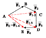 F Σ = F 1 + F 2 + F 3 + F 4. Одержаний багатокутник ABCDE називають силовим багатокутником. Замикаюча сторона багатокутника являє собою геометричну суму заданих сил, або їх рівнодійну. Аналогічно можна додати будь-яку кількість збіжних сил (знайти їх рівнодійну):
