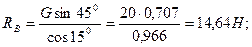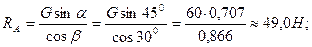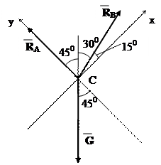 Складаємо рівняння рівноваги: Σ Fix = 0; – G sin 450 + RB cos 150 = 0; Σ Fiy = 0; – G cos 450 + RA + RB sin 150 = 0.