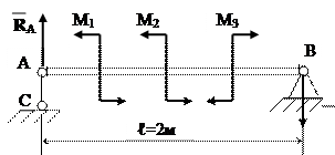 Брус лівим кінцем зв’язаний шарнірно з стержнем АС, а правим з циліндри- чним шарніром. На брус діють пари сил з моментами М1 = 24 Нм; М2 = 36 Нм; М3 = – 50 Нм. Визначити реакції, що діють на брус в т. А і В.