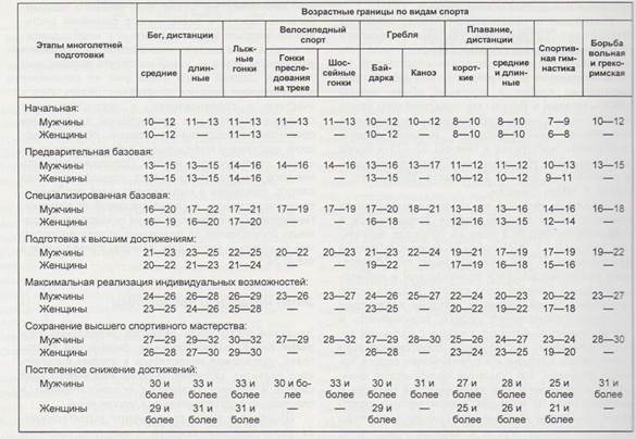 В процесі багаторічної підготовки виділяють три вікові зони - першіх великих успіхів, оптимальних можливостей, підтримки високих результатів (таблица5) ТАБЛИЦА 5