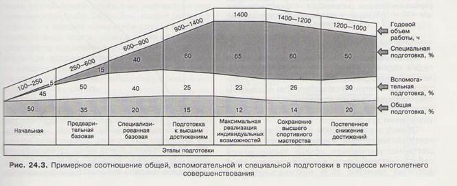 Від етапу до етапу змінюється співвідношення різних видів підготовки: - На етапі початкової підготовки основне місце займає загальна і допоміжна підготовка. - Етап попередньої базової підготовки характеризується збільшенням об'єму допоміжної підготовки, яка у сумі із загальною складає до 80-90 % загального об'єму тренувальної роботи. Доля спеціальної підготовки невелика і зазвичай не перевищує 15 % загального об'єму роботи. - Етап спеціалізованої базової підготовки відрізняється значною зміною співвідношення видів підготовки: істотно зростає доля спеціальної - зменшується загальна. - На етапах підготовки до вищих досягнень і максимальної реалізації індивідуальних можливостей спеціальна підготовка може досягати 65 % і більше від загального об'єму роботи. - На завершальних етапах підготовки - залишається високою доля спеціальної, проте може дещо зростати доля загальної і допоміжної.