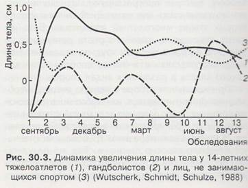 Рівень координаційних здібностей, наприклад, можливо визначити за якістю виконання складних вправ в процесі їх розучування. Оцінка ставиться залежно від амплітуди рухів, дотримання структурного і ритмічного малюнка вправи, уміння швидко міняти темп рухів відповідно до команди. Розміри тіла, об'єм і можливості м'язів хлопчиків і дівчаток до вступу їх в період статевого дозрівання практично не розрізняються. Тому в дитячому віці відмінності між хлопчиками і дівчатками в рівні швидкісно-силових якостей, витривалості і інших рухових якостей мінімальні. Це зумовлює і ідентичну змагальну результативність, а в окремих випадках і перевагу дівчаток над хлопчиками. Тому відносно невисокі досягнення хлопчиків в різних тестах і, особливо, в змагальній діяльності не повинні сприйматися як негативні в плані оцінки їх перспективності. Величезне значення при відборі дітей має оцінка стану їх здоров'я. Відсутність порушень в нормальній діяльності організму - одна з найважливіших умов досягнення успіху в сучасному спорті. Навіть незначні відхилення в стані здоров'я можуть істотно понизити пристосувальні можливості організму. Важливим моментом огляду дітей під час відбору для занять спортом являється порівняння їх паспортного і біологічного віку. Добре відомо, що від темпів статевого дозрівання залежать відмінності в рівні розвитку дітей однакового паспортного віку. Досвід же роботи дитячо-юнацьких спортивних шкіл свідчить, що часто має місце відбір дітей з прискореним біологічним розвитком, які надалі дуже швидко втрачають свої переваги і досить рано залишають заняття спортом. Значно більших успіхів на наступних етапах спортивного вдосконалення, як правило, домагаються діти з нормальним ходом дозрівання або які мають ознаки сповільненого біологічного розвитку. У таких дітей у віці 16-17 років відзначається різке підвищення функціональних можливостей різних органів і систем організму, тоді як у акселератів спостерігається стабілізація або навіть зниження морфофункціональних можливостей (мал. 30.5). Дослідження Т. С. Тимаковой (1985) показують, що серед 12-13-річних хлопчиків-плавців - переможців великих юнацьких змагань, що виконали норматив майстра спорту, 100 % характеризуються раннім типом статевого дозрівання. Серед 17-річних плавців, що добилися високих результатів, лише 4,5 % мали бал біологічної зрілості, відповідний дорослішим плавцям, а уповільнений розвиток був у 42% спортсменів. Ці дані, природно повинні враховуватися як при відборі, так і при орієнтації юних спортсменів. Серед дітей і підлітків, що рано виконують нормативи I спортивного розряду - майстра спорту, більше половини мають ознаки прискореного статевого розвитку. У числі спортсменів, що виконали нормативи майстрів спорту міжнародного класу, акселератів вже менше 20%. У світовій практиці вищі досягнення досить часто показують спортсмени з пізнім розвитком і украй рідко - з раннім. Зазвичай статеве дозрівання вважається раннім, якщо перші його ознаки з'являються у дівчаток у віці 8-9 років, а у хлопчиків - в 10 років. До середнього варіанту темпу статевого дозрівання у дівчаток відноситься початок появи перших його ознак в 10-11 років при загальній тривалості цього процесу в середньому 5-6 років, у хлопчиків - початок процесу у віці 12-13 років і завершення його до 18 років. Про