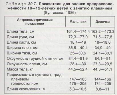 Перспективи юних спортсменів багато в чому визначають гідродинамічні (у плавців) і аеродинамічні якості тіла (у ковзанярів і велосипедистів), які також в невеликому ступені схильні до змін в ході спортивного вдосконалення. Ці якості особливо важливі для досягнення успіху на середніх і довгих дистанціях. В процесі початкового відбору слід широко використовувати прості педагогічні тести, які дозволяють оцінити рівень рухових здібностей дітей (таблиця. 30.9). При цьому перевагу слід віддавати тим тестам, які характеризують рухові здібності, в значній мірі обумовлені природними завдатками. Зокрема, особливу увагу слід віддавати тестам, що дозволяють оцінити швидкісні якості, координаційні здібності, витривалість при аеробній і анаеробній роботі.