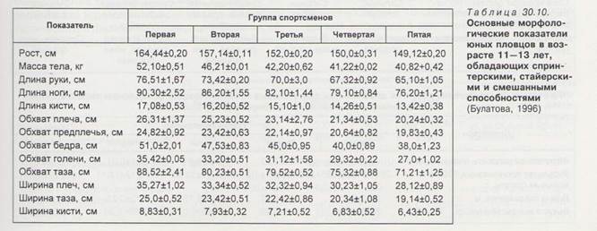 У генеральній сукупності ці групи представлені нерівномірно. Чисто спринтерський або стаєрський типи зустрічаються відносно рідко, більшість спортсменів відносяться до різних проміжних типів (мал. 30.15). Плавці, що входять в кожну з п'яти груп, суттєво розрізняються між собою за основними антропометричними ознаками, можливостями системи енергозабезпечення, психофізіологічними особливостями, рівнем розвитку спеціальних рухових якостей.