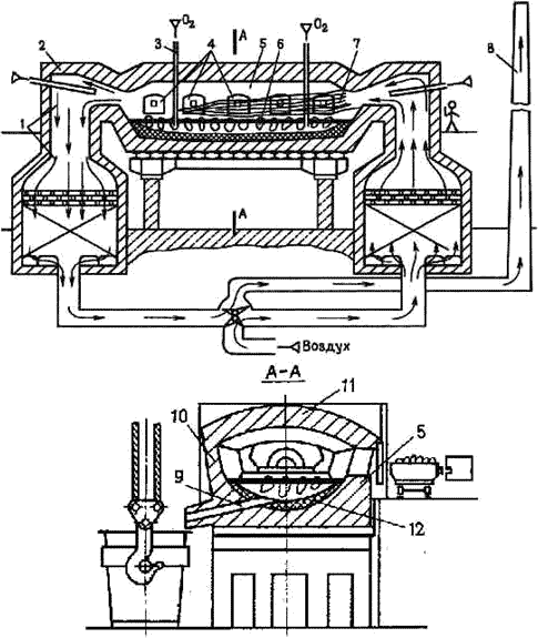 Производство стали в мартеновских печах Мартеновский процесс (1864-1865, Франция). В период до семидесятых годов являлся основным способом производства стали. Способ характеризуется сравнительно небольшой производительностью, возможностью использования вторичного металла – стального скрапа. Вместимость печи составляет 200…900 т. Способ позволяет получать качественную сталь. Мартеновская печь (рис.2.2.) по устройству и принципу работы является пламенной отражательной регенеративной печью. В плавильном пространстве сжигается газообразное топливо или мазут. Высокая температура для получения стали в расплавленном состоянии обеспечивается регенерацией тепла печных газов. Современная мартеновская печь представляет собой вытянутую в горизонтальном направлении камеру, сложенную из огнеупорного кирпича. Рабочее плавильное пространство ограничено снизу подиной 12, сверху сводом 11, а с боков передней 5 и задней 10 стенками. Подина имеет форму ванны с откосами по направлению к стенкам печи. В передней стенке имеются загрузочные окна 4 для подачи шихты и флюса, а в задней – отверстие 9 для выпуска готовой стали.
