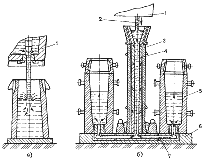 Рис.3.3. Разливка стали в изложницы а – сверху; б – снизу (сифоном)