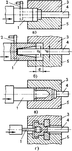 Штамп состоит из трех частей: неподвижной матрицы 3, подвижной матрицы 5 и пуансона 1, размыкающихся в двух взаимно перпендикулярных плоскостях. Пруток 4 с нагретым участком на его конце закладывают в неподвижную матрицу. Положение конца прутка определяется упором 2. При включении машины подвижная матрица 5 прижимает пруток к неподвижной матрице, упор автоматически отходит в сторону, и только после этого пуансон 1 соприкасается с выступающей частью прутка и деформирует ее. Металл при этом заполняет формующую полость, расположенную впереди зажимной части. Формующая полость может находиться только в матрице, только в пуансоне, а также в матрице и пуансоне. После окончания деформирования пуансон движется в обратном направлении, выходя из полости матрицы. Матрицы разжимаются, деформированную заготовку вынимают или она выпадает из них. Штамповка выполняется за несколько переходов в отдельных ручьях, оси которых расположены одна над другой. Каждый переход осуществляется за один рабочий ход ползуна. Осуществляются операции: высадка, прошивка, пробивка. За один переход можно высадить выступающий из зажимной части матрицы конец прутка только в том случае, если его длина не превышает трех диаметров. При большей длине возможен изгиб заготовки, поэтому предварительно необходимо произвести набор металла. Набор металла осуществляется в полости пуансона, которой придают коническую форму. В качестве исходной заготовки используют пруток круглого или квадратного сечения, трубный прокат. Штампуют поковки: стержни с утолщениями и глухими отверстиями, кольца, трубчатые детали со сквозными и глухими отверстиями. Так как штамп состоит из трех частей, то напуски на поковки и штамповочные уклоны малы или отсутствуют. К недостаткам горизонтально-ковочных машин следует отнести их малую универсальность и высокую стоимость.