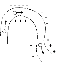 Обратим внимание на то, что мы можем легко изменять направление тока в проволоке, просто изгибая проволоку. На изгибе, очевидно, на большем радиусе изгиба осядут отрицательные заряды, чтобы отталкивать своих собратьев, на меньшем радиусе изгиба накопится положительный заряд, тогда электроны при движении по проволоке будут «чувствовать», что им нужно поворачивать.