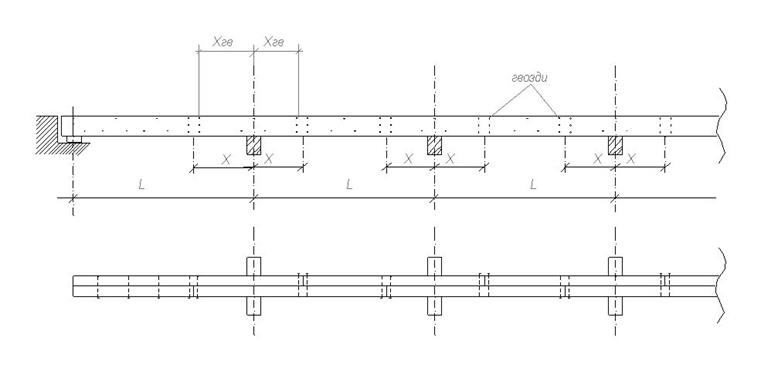 При определении усилия Консольно-балочные прогоны являются многопролетными статистически определяемыми системами. Их применение целесообразно в том случае, когда временная нагрузка неподвижна и равномерно распределена по всем пролетам прогона. Если стык на х=0,15 l, то равномоментное решение прогона кратные пролеты Мпролет=Мопор Для выравнивания моментов Если шарниры на х=0,21 l, то равнопрогибное решение, для выравнивания прогибов кратные пролеты l Если крайний пролет 0,79 l, то