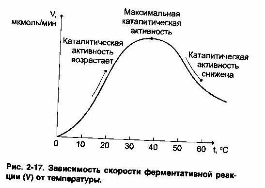 СВОЙСТВА ФЕРМЕНТОВ. 1.Высокая каталитическая активность. 2.Ферменты, являясь белками, проявляют термолабильные свойства - чувствительность к изменению температуры. При повышении температуры на каждые 10 градусов Цельсия, скорость ферментативных реакций повышает в 1,5 - 2 раза (правило Вант - Гоффа). Это правило применимо для ферментов в очень узком интервале температуры, т.к. уже при 50-60 градусах наблюдается денатурация, а при 100 градусов Цельсия - полная денатурация с потерей активности. При 1-3 градусов Цельсия Активность фермента также понижается, но при понижении температуры структура его сохраняется, поэтому при последующем повышении температуры активность восстанавливается. Это свойство используется в клинической практике при проведении оперативных вмешательств. Температура, при которой фермент проявляет максимальную активность, называется оптимальной.