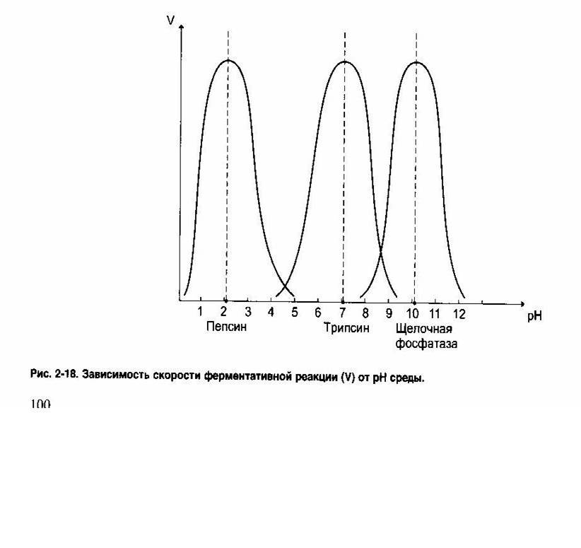 3.Ферменты чувствительны к изменениям рН среды. Для большинства ферментов оптимальные значения РН лежат в нейтральной среде (для каталазы рН = 7). Есть ферменты, для которых оптимальные значения рН лежат в кислой среде (пепсин рН = 1,5-2,5). Некоторые ферменты проявляют активность в щелочной среде (аргиназа рН = 10 - 11). Изменения рН приводит к изменению степени ионизации кислых и основных групп в активном центре фермента, т.к. эти группы участвуют в связывании субстрата и его превращении. Изменение рН приводит к конформационной перестройке не только активного центра фермента, но и всей молекулы фермента. Это может сопровождаться нарушением третичной структуры фермента. При оптимальном значении рН функциональные группы активного центра находятся в наиболее реакционно-способном состоянии, и это обеспечивает образование фермент-субстратного комплекса.