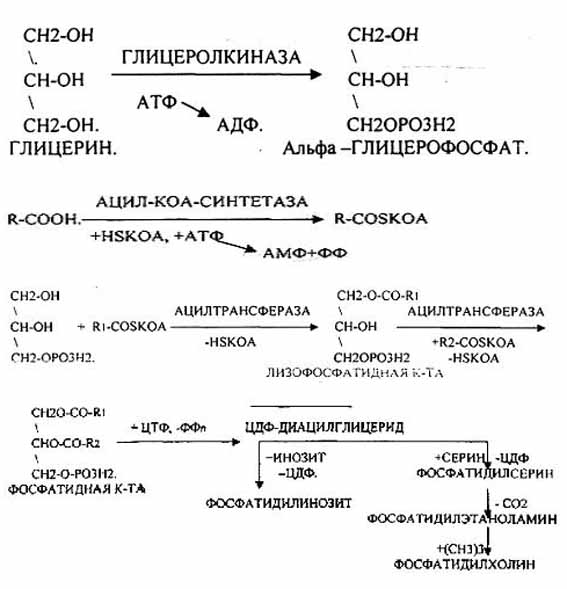 Ïîñëå òîãî êàê ïðîäóêòû ãèäðîëèçà æèðà ïîñòóïèëè â ÝÍÒÅÐÎÖÈÒÛ, â ñòåíêå êèøå÷íèêà íà÷èíàþò ñèíòåçèðîâàòüñÿ æèðû, ñïåöèôè÷åñêèå äëÿ äàííîãî îðãàíèçìà, êîòîðûå ïî ñâîåìó ñòðîåíèþ îòëè÷àþòñÿ îò ïèùåâîãî æèðà. Ìåõàíèçì ðåñèíòåçà æèðà â ñòåíêå êèøå÷íèêà ñâîäèòñÿ ê ñëåäóþùåìó: Ñíà÷àëà ïðîèñõîäèò àêòèâàöèÿ ãëèöåðèíà è ÂÆÊ çàòåì ïîñëåäîâàòåëüíî áóäåò ïðîèñõîäèòü ÀÖÈËÈÐÎÂÀÍÈÅ àëüôà -ÃËÈÖÅÐÎÔÎÑÔÀÒÀ ñ îáðàçîâàíèåì ÌÎÍÎ- è ÄÈÃËÈÖÅÐÈÄÎÂ. Àêòèâíàÿ ôîðìà ÄÈÃËÈÖÅÐÈÄÀ - ÔÎÑÔÀÒÈÄÍÀß Ê-ÒÀ çàíèìàåò öåíòðàëüíîå ìåñòî â ñèíòåçå æèðà ê ñòåíêå êèøå÷íèêà. Èç íå¸ ïîñëå àêòèâàöèè â ïðèñóòñòâèè ÖÒÔ îáðàçóåòñÿ ÖÄÔ -ÄÈÀÖÈËÃËÈÖÅÐÈÄ, êîòîðûé äà¸ò íà÷àëî ñëîæíûì æèðàì.