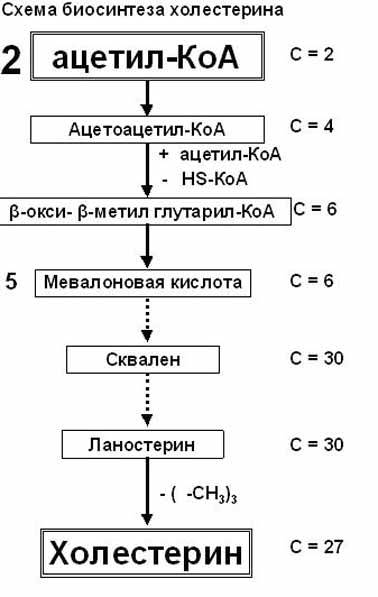 Регуляторным ферментом, от активности которого зависит возможность и интенсивность биосинтеза холестерина является бета-гидроксиметил-глутарил - КоА –редуктаза. Этот фермент является объектом действия лекарственных гипохолестеринемических препаратов. Источником образования холестерина является ацетил-КоА при распаде белков, липидов и углеводов Образовавшийся в результате распада мембранных ЛИПИДОВ, а также излишки холестерина клеток выводятся с помощью ЛПВП для последующего окисления в печень.Конечными продуктами окисления холестерина и его производных являются желчные кислоты,которые удаляется из организма в составе каловых масс в виде КОПРОСТЕРИНОВ.