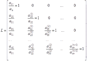 Уравнения 1), 2) и 3) составляют искомую треугольную матрицу после “прямого хода”. Число шагов преобразований в “прямом ходе” методом Гаусса равно n -1. Коэффициенты а 11, При “обратном ходе” можно использовать строки таблицы, содержащие единицы, т.е. вспомогательные уравнения. Имеем